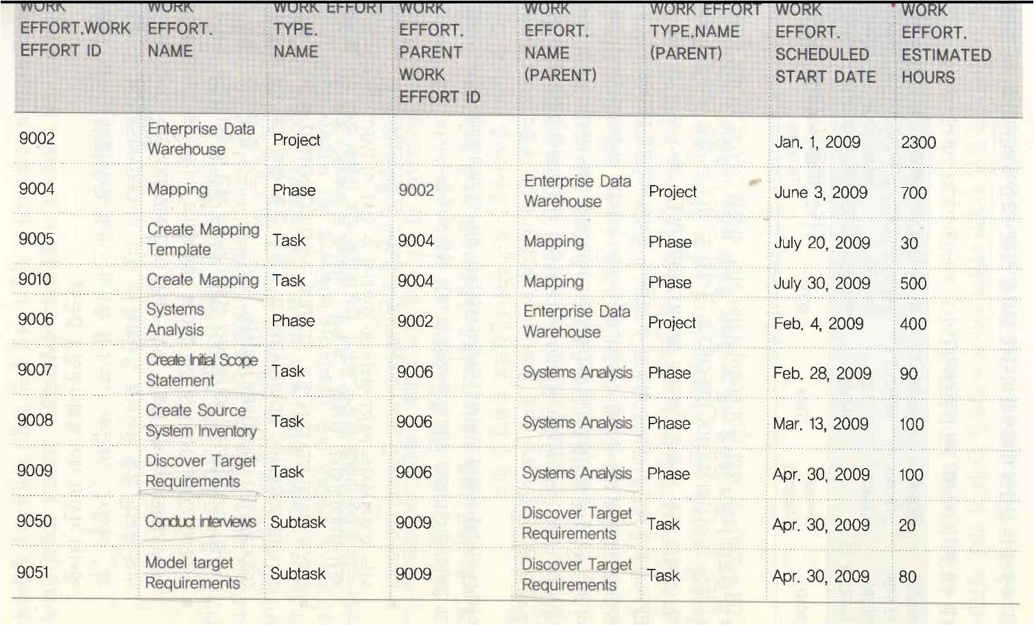 동료 작업 활동(Peer Work Effort ) : 작업 세분화 구조 내에 있는 , 동일한 레벨의 데이터하우징 작업 활동들과 같은 다양한 작업 활동들의 동료간 릴레이션쉽