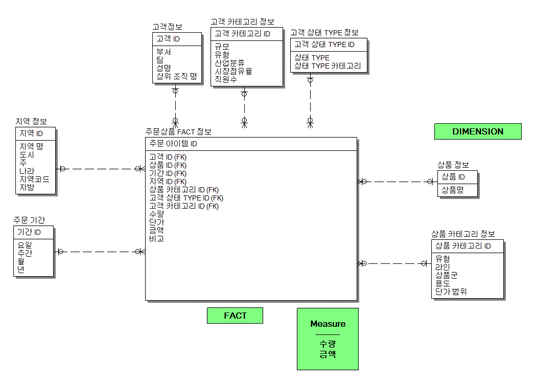 고객, 상품, 지리적 위치, 시간 (일, 월, 년, 주) 등과 같은 Dimension으로 주문수량과 주문금액을 리포팅하는 요구