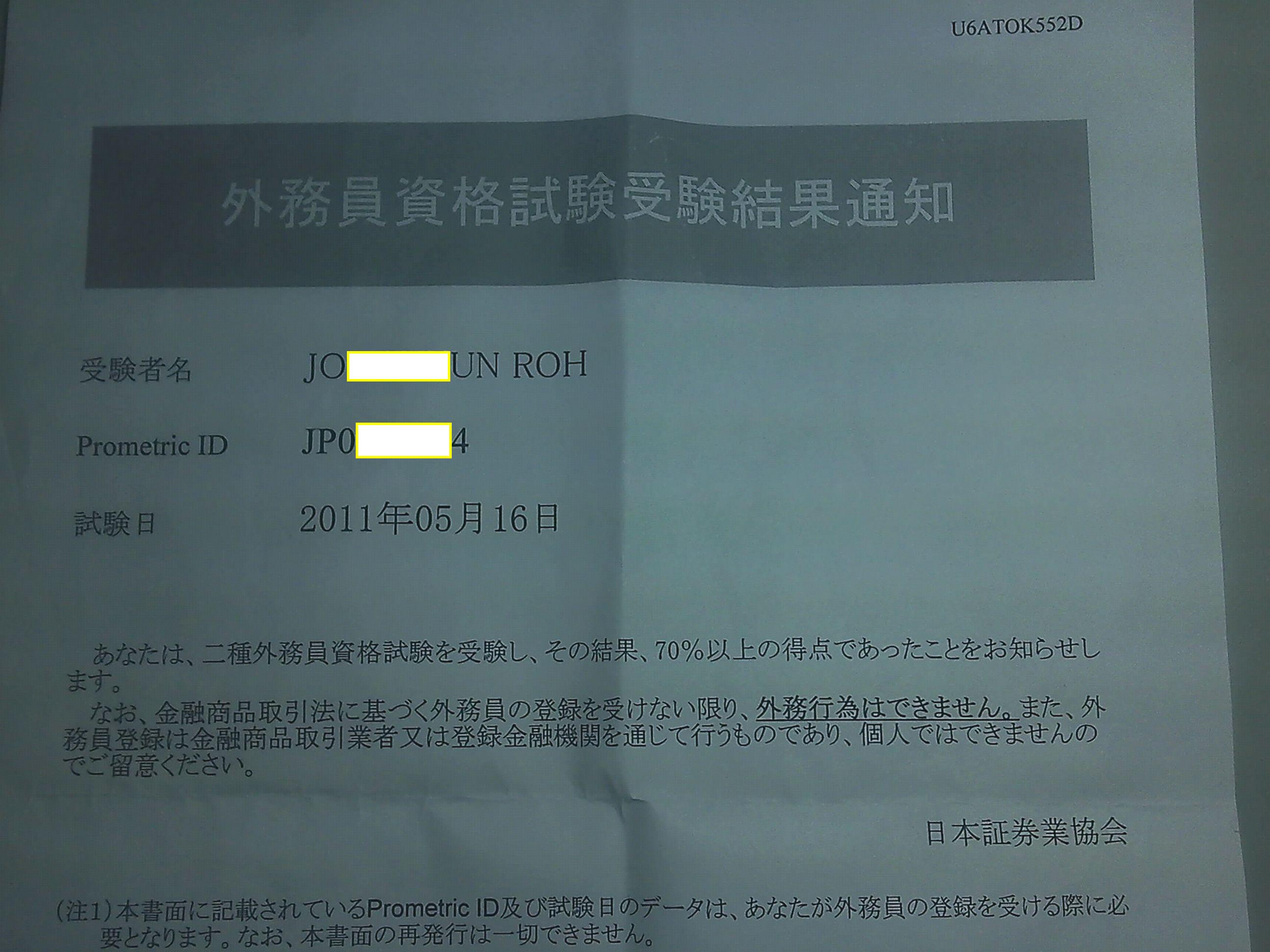 外務員資格試?受?結果通知(외무인자격시험수험결과통지)あなたは、二種外務員資格試?を受?し、その結果、70%以上の得点であったことをお知らせします。なお、金融商品取引法に基づく外務員の登?を受けない限り、外務行?はできません。また、外務員登?は金融商品取引業者又は登?金融機?を通じて行うものであり、個人ではできませんのでご留意ください。( 당신은, 2종외무인자격시험을 치뤄, 그 결과, 70%이상의 득점임을 알려드립니다.덧붙여, 금융상품거래법에 준하여 외무인의 등록을 하지않는 한, 외무행위는 할 수 없습니다. 또, 외무인등록은금융상품거래업자 또는, 등록금융기관을 통해서 행하는것으로, 개인은 불가능하므로유의하시기바랍니다. )※70% 이상이 합격선입니다.