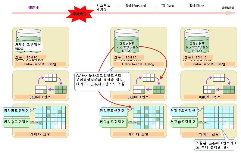 → 시스템의 비정상종료후, 재기동시에 Redo로그화일의 내용을 이용 종료전의 버퍼캐쉬상태로 복구.