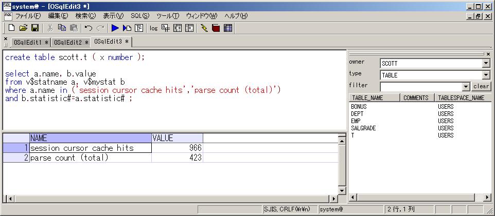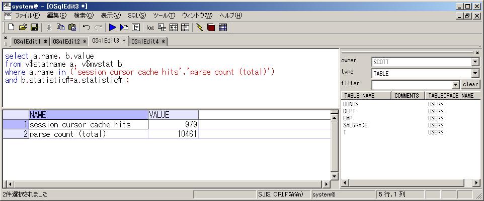 이때의 session cursor cache hits와 parse count의 변화를 관찰해보자.