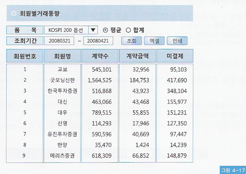 - 주식종목에 대한 회원사(증권사)별 거래실적 집계 쿼리