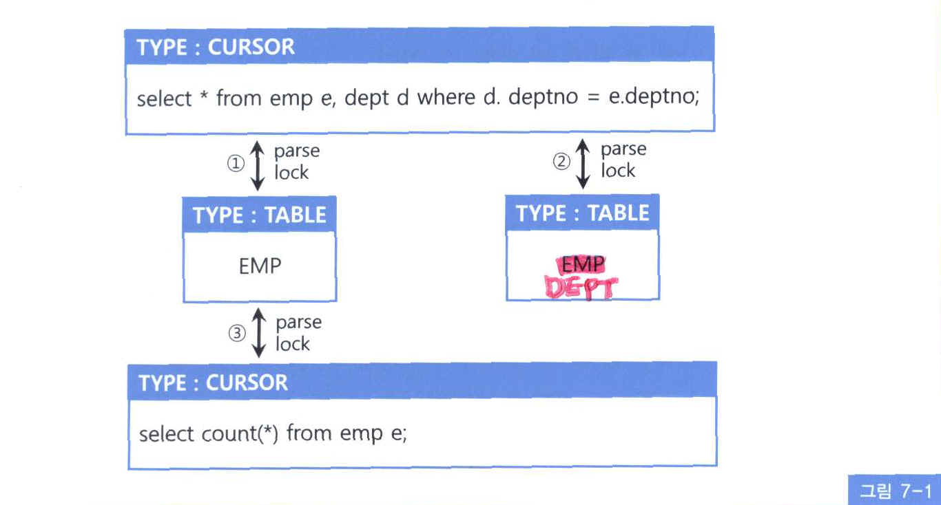 - 스키마 오브젝트는 변경되거나 Drop 되면 커서를 참조하는 LOC는 무효화되어야 한다. 커서는 자기가 참조하는 객체에 대하여 Parse Lock을 보유한다. 객체가 변경되면 Parse Lock 해제되고 커서는 무효화된다.