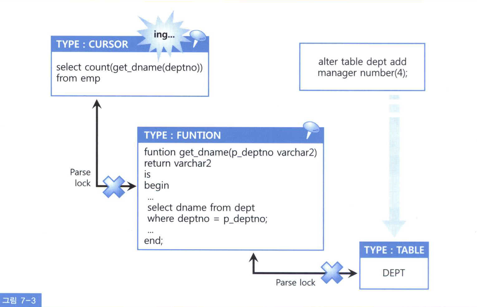 select 문 실행 중 -> Shared 모드로 pin 설정 -> get_dname() 함수도 Shared 모드로 pin 유지 -> DEPT 테이블 변경