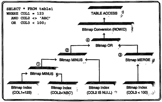 - COL1 인덱스에서 123 비트맵 액세스, COL2 인덱스에서 ABC 비트맵 액세스 후 감산 연산 수행