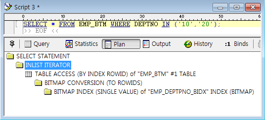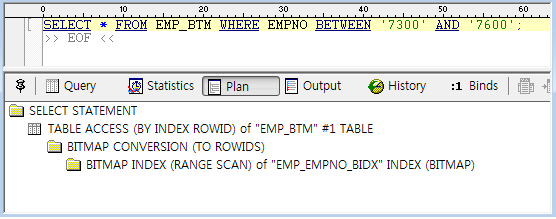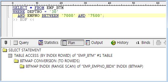 - 등식 조건의 엑세스 수행 결과를 'BITMAP MINUS' 를 통하여 제거 처리