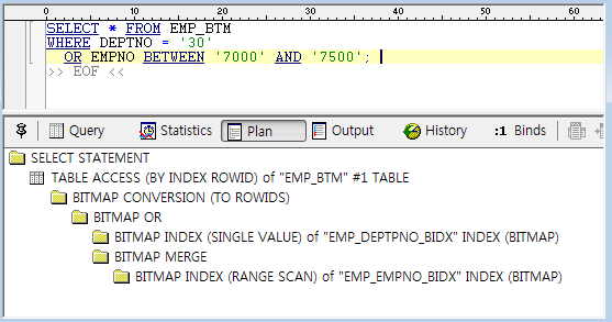 - 부정형 조건('<>') 이 OR 연산에 사용 시 하나의 비트맵 인덱스만 사용
