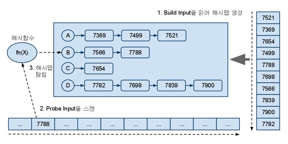 2. 반대쪽 큰 집합(Probe Input)을 읽어 해시 테이블을 탐색하면서 조인하는 방식이다.(그림-3번 해시 함수에서 리턴 받은 버킷 주소로 찾아가 해시 체인을 스캔하면서 데이터를 찾는다)