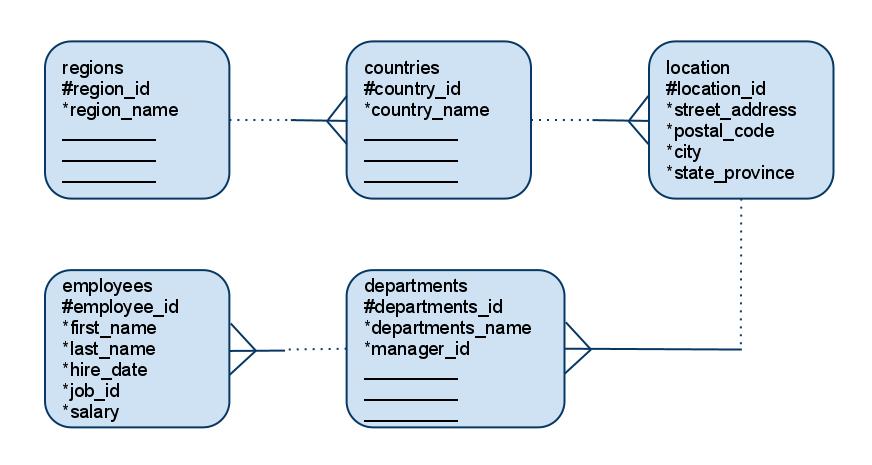 FROM REGIONS R, COUNTRIES C, LOCATIONS L, DEPARTMENTS D, EMPLOYEES E