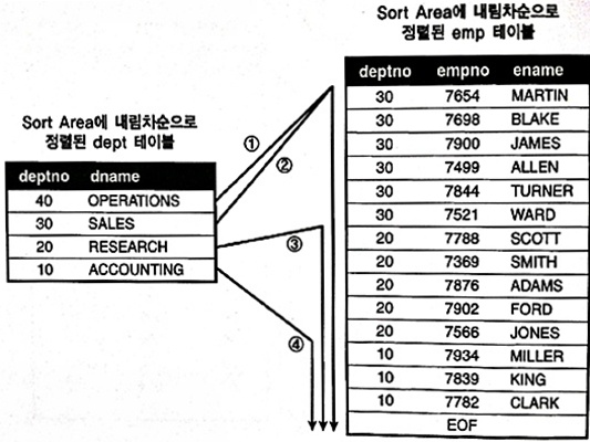 3. Sort Area에 정렬된 dept 테이블을 스캔하면서, 정렬된 emp 테이블과 조인