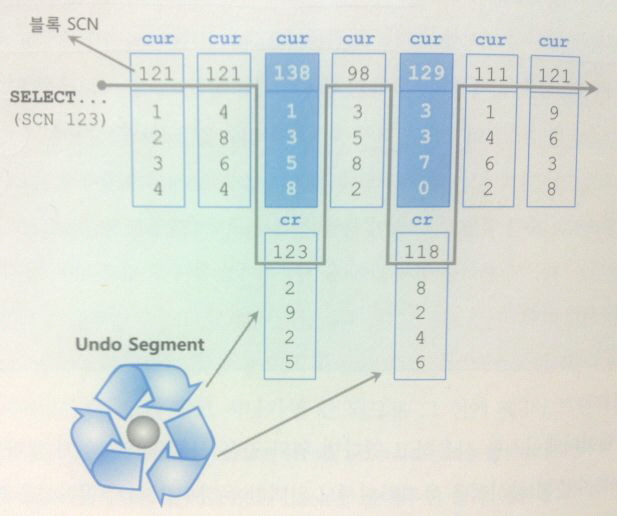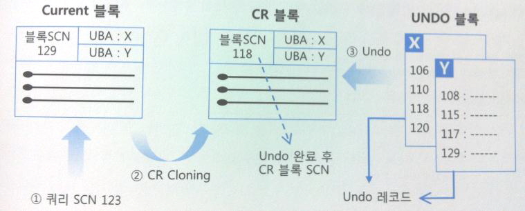 - 변경이 발생한 블록을 읽을 때는 현재의 Current 블록으로부터 CR 블록을 생성해서 쿼리가 시작된 시점으로 되돌린 후 그것을 읽는다.