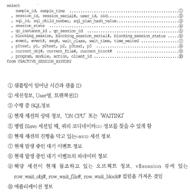 ASH버퍼에 저장된 세션 히스토리 정보를 조회할 수 있다.