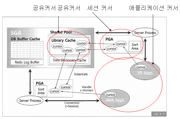 - Private SQL Area (라이브러리 캐시에 공유된 커서를 실행할때 우선 PGA영역에 메모리 할당) 에 저장된 커서