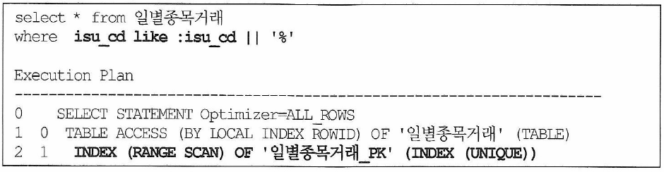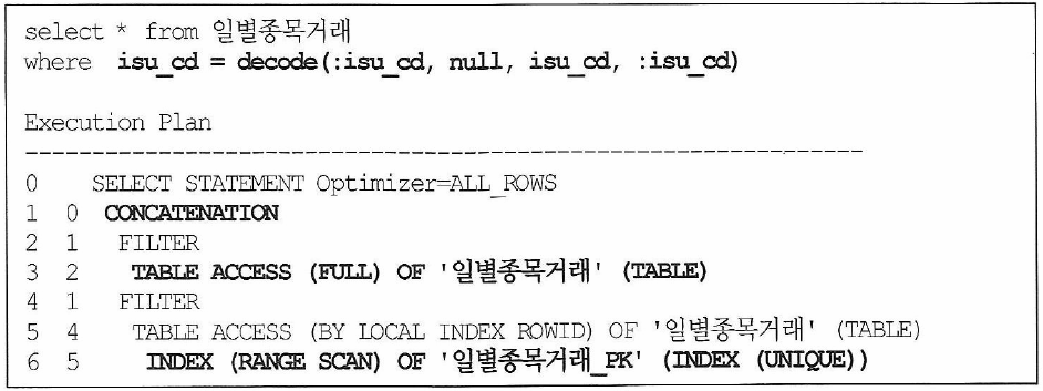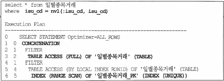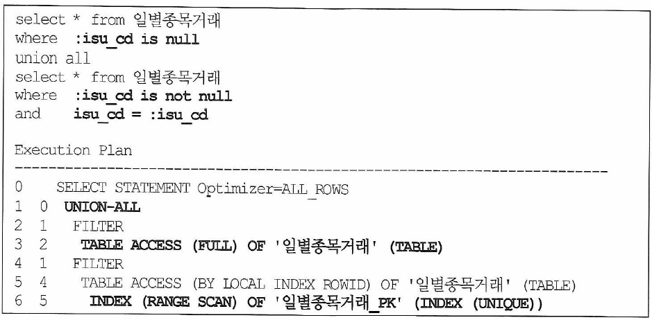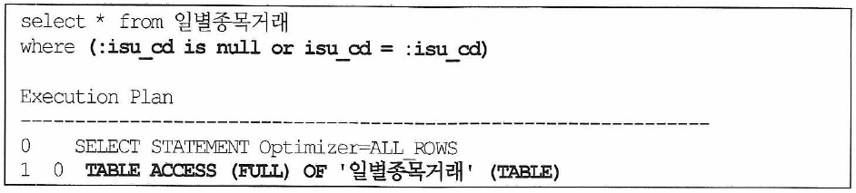 - c,d 방식은 사용자의 :isu_cd 입력 여부에 따라 full table scan과 index scan으로 실행계획이 자동 분기