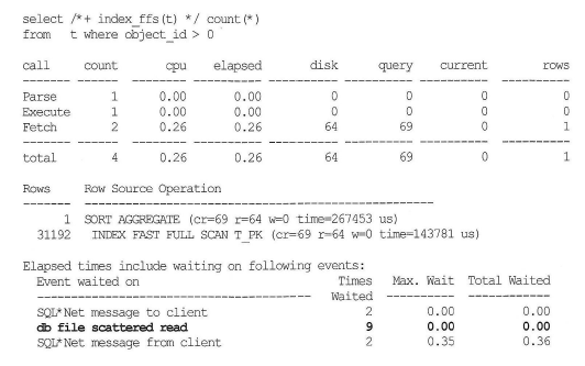 또한 이벤트를 보면 db file sequential read 대기 이벤트가 64번 발생했다.