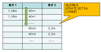 o. 아직 no=2인 첫 번째 레코드에 도달하지 않은 상태에서 다른 세션에서 아래 쿼리를 수행하면