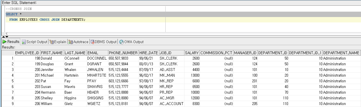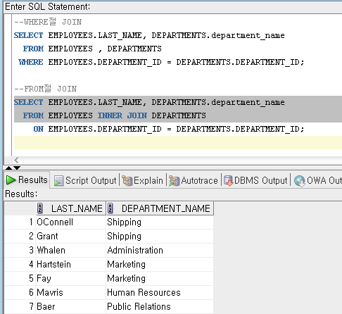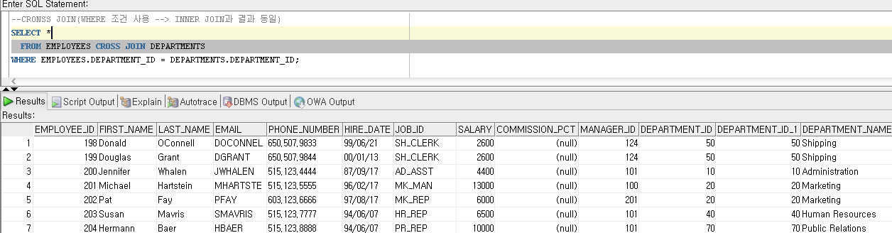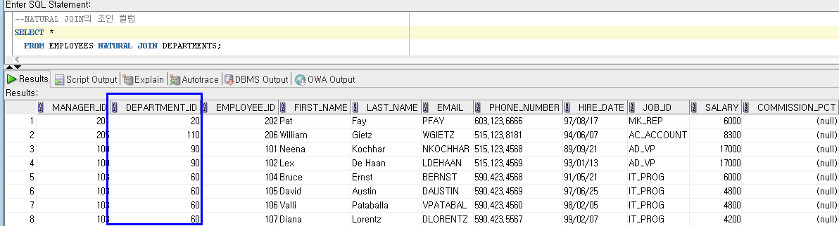 WHERE EMPLOYEES.DEPARTMENT_ID = DEPARTMENTS.DEPARTMENT_ID;