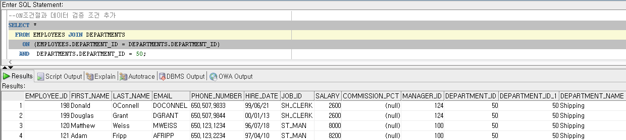 ON조건절에 JOIN 조건절 이외에 데이터 검색조건을 추가할 수 있음 (WHERE 절 사용 권장)