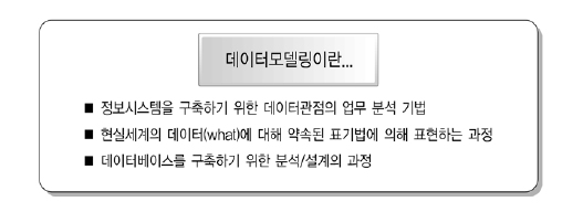- 현실 세계에 존재하는 개체를 인간이 이해할 수 있는 정보 구조로 표현 = 정보 모델