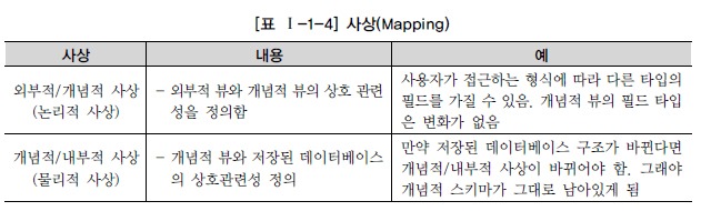 논리적 사상 : 외부 화면이나 사용자에게 인터페이스하기 위한 스키마 구조는 전체가 통합된 개념적 스키마와 연결된다는 것