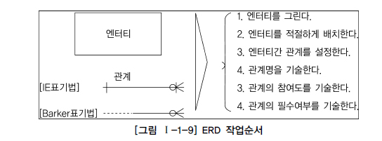 ① 엔터티를 그린다. ② 엔터티를 적절하게 배치한다. ③ 엔터티간 관계를 설정한다. ④ 관계명을 기술한다. ⑤ 관계의 참여도를 기술한다. ⑥ 관계의 필수여부를 기술한다.