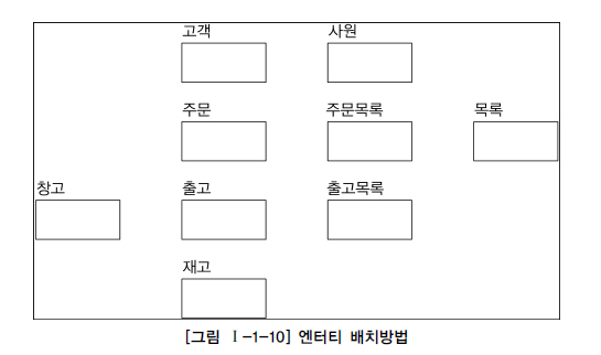 "그림 Ⅰ-1-10"의 데이터 모델에서도 가장 중요한 엔터티인 고객과 주문을 왼쪽 상단에 배치하여 다른 엔터티를 연결하는 방식으로 엔터티를 배치하였다. 주문에 따라 출고가 이루어졌으므로 주문이 위에 출고가 아래에 위치해 있다. 두 번째 업무흐름에 중심이 되는 엔터티, 보통 업무 흐름에 있어서 중심이 되는 엔터티는 타 엔터티와 많은 관계를 가지고 있으므로 중앙에 배치하도록 한다. "그림 Ⅰ-1-10"에서는 주문, 출고, 주문목록, 출고목록이 업무의 중심엔터티에 해당한다. 세 번째는 업무를 진행하는 중심엔터티와 관계를 갖는 엔터티들은 중심에 배치된 엔터티를 주위에 배치하도록 한다. "그림 Ⅰ-1-10"에서는 창고, 고객, 사원, 재고가 이에 해당한다.