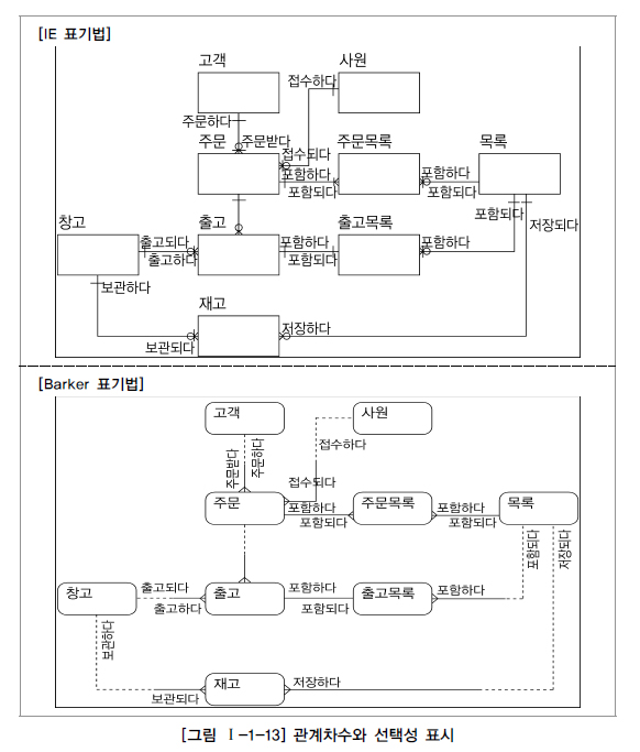 5) ERD 관계 관계차수와 선택성 표시 관계에 대한 이름을 모두 지정하였으면 관계가 참여하는 성격 중 엔터티내에 인스턴스들이 얼마나 관계에 참여하는 지를 나타내는 관계차수(Cardinality)를 표현한다. "그림 Ⅰ-1-13"은 관계의 관계차수를 지정한 ERD의 모습을 보여준다. 관계설명에서도 언급하겠지만 IE표기법으로는 하나(1, One)의 관계는 실선으로 표기하고 Barker표기법으로는 점선과 실선을 혼합하여 표기한다. 다수참여(Many)의 관계는 까마귀발과 같은 모양으로 그려준다. 또한 관계의 필수/선택표시는 관계선에 원을 표현하여 ERD를 그리도록 한다.